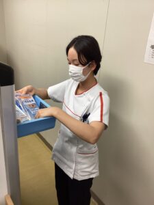 2021年7月より、乳腺内分泌外科外来にて主に注射または経口抗がん剤を使用する乳がん患者を対象に薬剤師外来を開始しました。副作用モニタリングや薬剤説明を木・金曜日の週2回午前9-12時の間、乳腺内分泌外科診察室の1室を使用し、医師の診察前に対面形式にて実施しています。